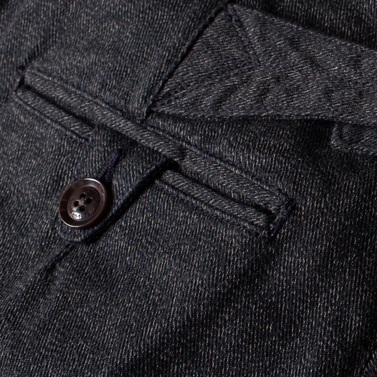特徴的なテング、サスペンダーボタン、フラップ付きのコインポケット、